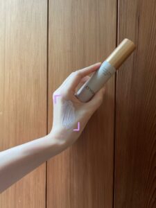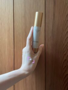 私が選んだカラーは、ラベンダーベージュ。顔に塗ってみると、青みがかった色がうっすらツヤに変化しながら広がり、始めは「えぇ?青?」と驚くのですが、くすんだ肌を透明感のある、晴れやかな顔色にしてくれます。赤みやシミなどへのカバー力はほぼありませんが、ファンデーションやコンシーラーをのせても肌をくすませない力は絶大です。そして、私の使い方は、下地を容器から2プッシュ出し、両頬の中心と口角の下の部分に下地をのせ、それぞれこめかみに向けて引き上げるように塗り広げ、残りをおでこや鼻、瞼などにうっすら塗る方法です。