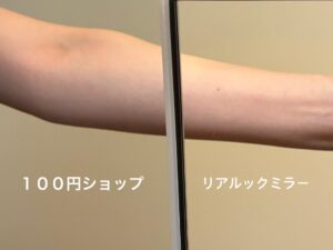 ↑向かって左が100円ショップのミラー、向かって右がリアルックミラー。隣同士に並べて映した私の腕でございます。お見苦しい写真で申し訳ございません🙇♀️腕の色の違い、壁紙の色の違いがおわかりいただけると思いますが、リアルックミラーの方が腕が鮮明に写り、壁紙の色が黄色く見えますよね?この繊細な違いが、メイクをするうえで大事になってきます。